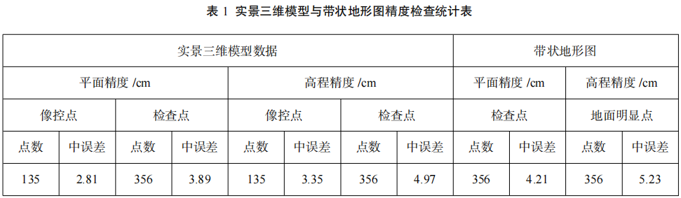 為了檢測本次實景三維模型成果以及帶狀地形圖的精度,均勻選取三維模型與地形圖內(nèi)房角以及地面具有明顯特征的若干個檢查點,利用全站儀和 ZJCORS 網(wǎng)絡(luò) RTK 實測的方法,將實測坐標與從模型及地形圖上量測的解析坐標進行比對,經(jīng)統(tǒng)計分析后的結(jié)果如表 1 所示。