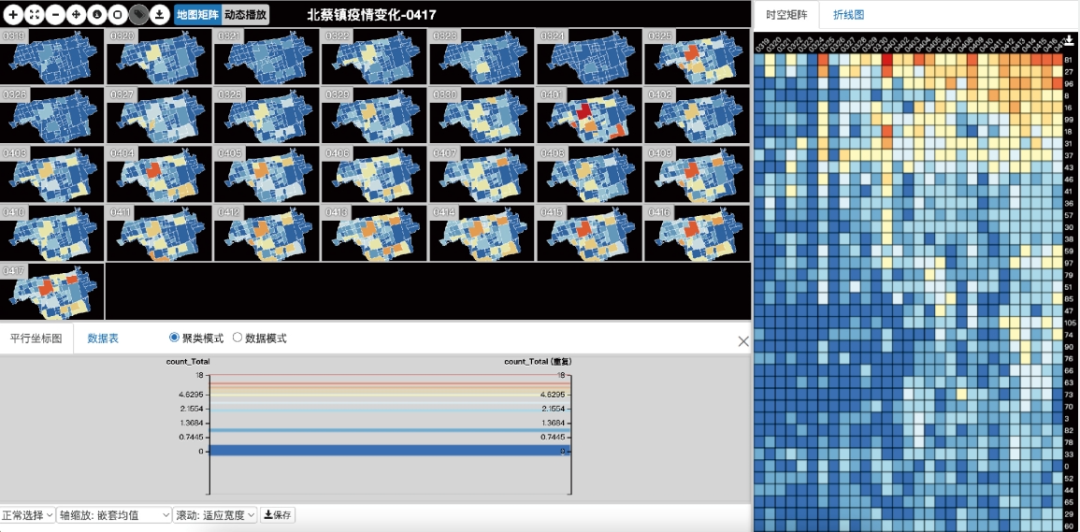 再以人們最熟悉的疫情時(shí)空地圖為例,其包括地圖矩陣、地圖動(dòng)態(tài)播放、時(shí)空矩陣、疫情曲線等功能模塊,可以揭示疫情發(fā)展變化規(guī)律。其中最具有特色的時(shí)空矩陣功能,可以對(duì)圖中的空間單元(鄉(xiāng)鎮(zhèn)街道)根據(jù)疫情時(shí)空變化進(jìn)行分組和排序,輔助決策。