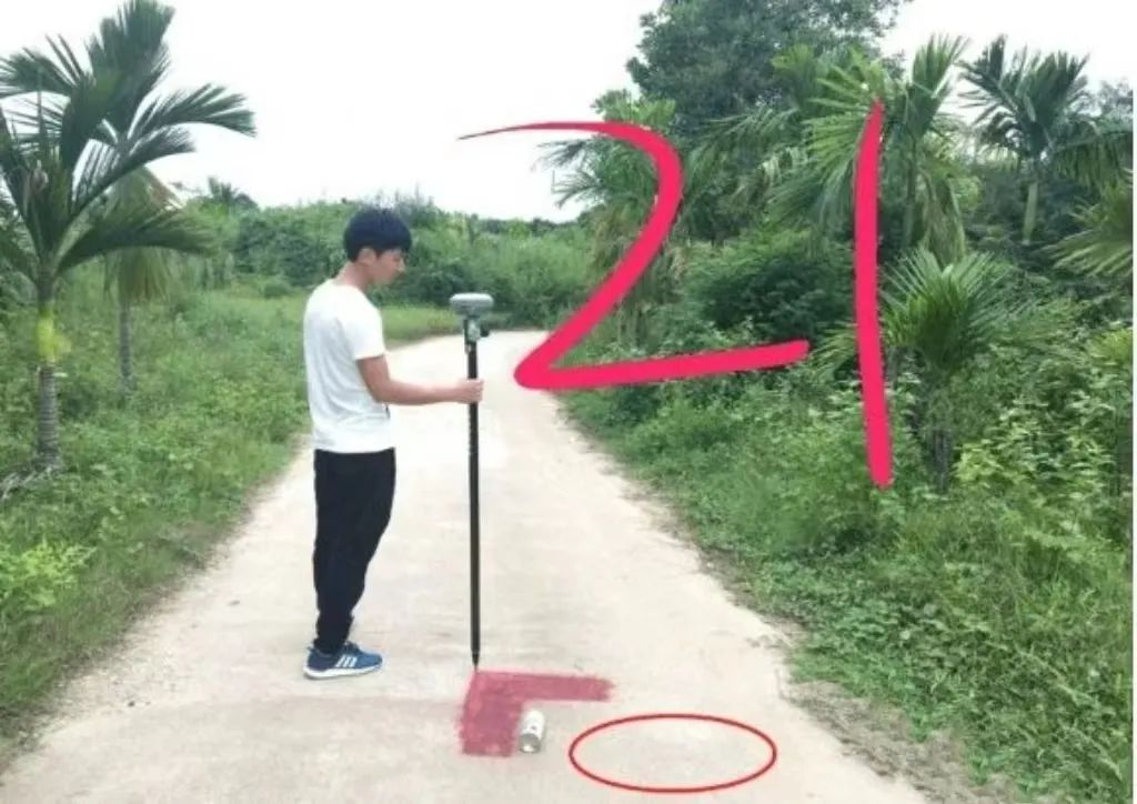 這是用手搖罐裝噴漆噴在地上的像控,可以明顯看到,L型的標(biāo)志外角點(diǎn)是我們采集的坐標(biāo)點(diǎn),(整個(gè)測(cè)區(qū)不要頻繁變換角點(diǎn)采集,如果一開(kāi)始采集的是外角點(diǎn),那整個(gè)項(xiàng)目最好都使用外角點(diǎn),方便內(nèi)業(yè)人員處理)。