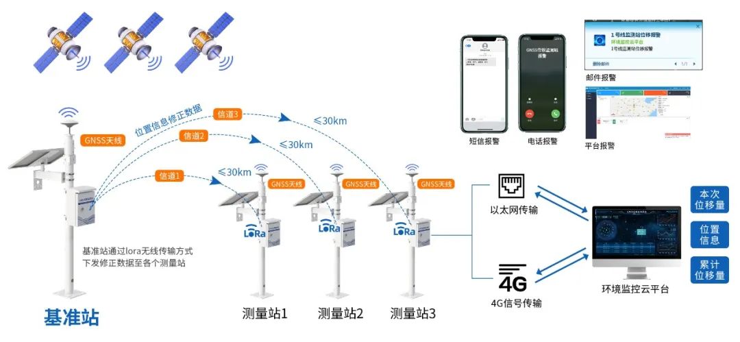 GNSS位移監(jiān)測(cè)站會(huì)自動(dòng)將監(jiān)測(cè)到的位移變化數(shù)據(jù)通過(guò)4G或以太網(wǎng)的方式上傳至環(huán)境監(jiān)控云平臺(tái),用戶(hù)可以隨時(shí)隨地在手機(jī)或電腦上登錄平臺(tái)查看實(shí)時(shí)、歷史、報(bào)警數(shù)據(jù),并導(dǎo)出、打印,還可以查看不同監(jiān)測(cè)站所在地理位置及在線(xiàn)/離線(xiàn)信息。