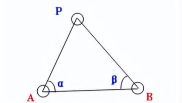 前方交會:在己知的兩個(或兩個以上)己知點(A,B)上架站通過測量α角和β角,計算待測點(P)坐標的方法。如下圖所示,紅色字母代表的站點為架站點(A,B):