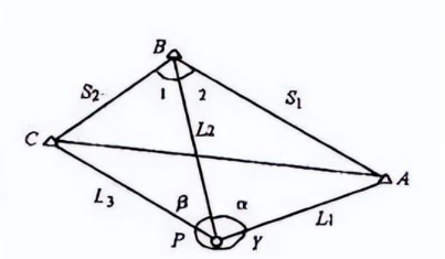 如圖所示,P點為后方交會點,ABC是控制網中的已知點,通過測量邊長L1、L2、L3,角度α、β、γ,應用解析公式,即可計算出P點的坐標。