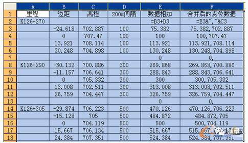 將現(xiàn)場(chǎng)測(cè)量數(shù)據(jù)錄入Excel中,數(shù)據(jù)格式如下表一,其中D列的100,300,500的等差數(shù)組,是為了在CAD上能按斷面里程從左至右依次畫多個(gè)斷面圖。使它們不會(huì)出現(xiàn)上一斷面的右部與下一斷面的左部相交。在E3、F3中先分別輸入E2、F2數(shù)據(jù)并回車后再點(diǎn)擊E3、F3,表格亮顯后按住右下角的“十”字拖動(dòng)成了點(diǎn)位數(shù)據(jù)列。