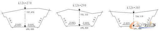 根據(jù)縱曲線數(shù)據(jù)計(jì)算出K126+270、K126+290、K126+305斷面的中樁高程為分別為690.000、690.800、691.400。K126+270斷面的標(biāo)準(zhǔn)圖形根據(jù)點(diǎn)位坐標(biāo)(100,690.000)在CAD中按照路面橫坡往兩側(cè)繪制路基線,然后在兩側(cè)將邊坡線連接在路基的兩邊。如果后面的斷面與本斷面也是相同的話,使用CAD中的Copy命令進(jìn)行復(fù)制。方法是在文本窗口中:選擇所有線形,回車確認(rèn)后在“指定基點(diǎn)或位移”時(shí)我們將基點(diǎn)選擇在(100,690.000),對(duì)于后面的“指定位移的第二點(diǎn)或 <用第一點(diǎn)作位移>:”時(shí)輸入(300,690.800)回車后繼續(xù)輸入(500,691.400)。這樣K126+290、K126+305的標(biāo)準(zhǔn)斷面就成了。