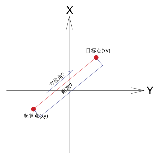 坐標(biāo)反算可以看作是坐標(biāo)正算的逆運(yùn)算,指已知起算點(diǎn)和目標(biāo)點(diǎn)的坐標(biāo),計(jì)算起算點(diǎn)到目標(biāo)點(diǎn)的距離和方位角。再看一張圖: