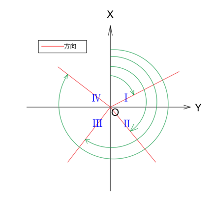 是不是還是難以理解?腦子里放一個(gè)線段,把測(cè)量坐標(biāo)系的圖移過去,原點(diǎn)與一個(gè)端點(diǎn)重合,從x方向開始想象有一條線順時(shí)針旋轉(zhuǎn)到與線段重合,旋轉(zhuǎn)的角度就是與原點(diǎn)重合的點(diǎn)到另一點(diǎn)的方位角的值。