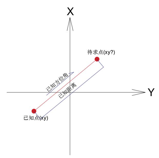 坐標(biāo)正算是指已知起算點(diǎn)的坐標(biāo)及至目標(biāo)點(diǎn)的距離和方位角,計(jì)算目標(biāo)點(diǎn)的坐標(biāo)??匆幌聢D更容易理解。