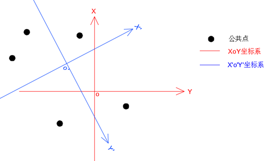 在實(shí)際的工作中,并沒有現(xiàn)成的旋轉(zhuǎn)角和平移值供我們使用,因此利用公式直接計(jì)算會(huì)很困難。腫么辦呢?我們只有利用公共點(diǎn)計(jì)算旋轉(zhuǎn)角和平移值,從而解算其他未知點(diǎn)。所謂公共點(diǎn),是指該點(diǎn)同時(shí)具有兩個(gè)坐標(biāo)系的坐標(biāo),在實(shí)際中很容易根據(jù)定義或計(jì)算獲得。