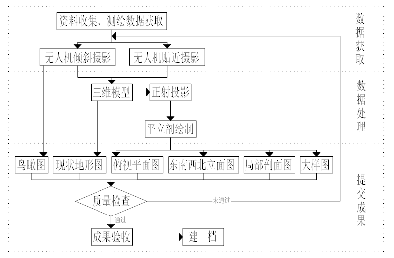 首先,收集古建筑的歷史資料、測(cè)繪基礎(chǔ)資料;其次,利用無(wú)人機(jī)對(duì)石塔周邊30米范圍內(nèi)的地形地貌進(jìn)行傾斜攝影測(cè)量,對(duì)石塔進(jìn)行環(huán)繞式的貼近攝影測(cè)量;然后,運(yùn)用三維重建軟件進(jìn)行精細(xì)化建模;最后,利用繪圖軟件生產(chǎn)數(shù)字化地形圖、立面圖、大樣圖等測(cè)繪產(chǎn)品。技術(shù)路線如圖1所示。