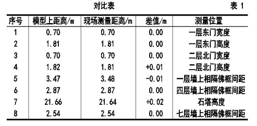筆者在模型上丈量8個(gè)尺寸,與在現(xiàn)場(chǎng)用手持測(cè)距儀、全站儀相應(yīng)位置測(cè)量距離,進(jìn)行對(duì)比,如表1,差值在1~2厘米,完全滿足歷史建筑測(cè)繪的精度要求。