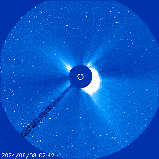 SOHO日冕圖像中的每一粒“雪”都是由一個充滿活力的質(zhì)子撞擊航天器的相機引起的。透過這些“雪花點”,可以看到一個明亮的日晷從爆炸現(xiàn)場冒出來。