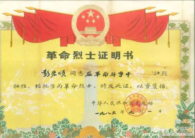 1983年9月1日,中華人民共和國(guó)民政部批準(zhǔn)彭宏順同志為“革命烈士”。