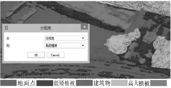 同時,通過實地踏勘和實景照片對比可以發(fā)現(xiàn),自動分類的點云數(shù)據(jù)存在一定的錯誤分類,如將植被識別成地面點、將地面點識別成樓面點等,這些數(shù)據(jù)的錯誤識別會對后期的土方計算造成影響,在計算前需要進行一定的糾正。本次試驗采用目視糾正分類方法對自動分類結(jié)果進行糾正,對于錯分類地物點進行重新分類。同時將分類圖與實景照片進行疊加,實現(xiàn)對非地面點云細化分類,創(chuàng)建高大植被、低矮植被、建筑物、湖泊等新數(shù)據(jù)類型。目視糾正后分類結(jié)果如下圖所示。