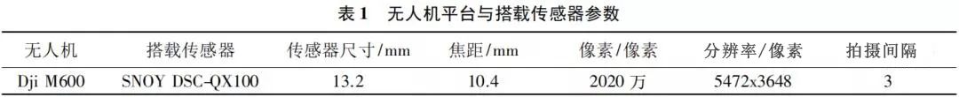 本文工程使用DjiMatrice600電動多旋翼無人機,通過搭載五鏡頭高分辨傾斜相機進行同步影像數(shù)據(jù)采集,并搭載高精度IMU/POS裝置對無人機位置信息進行實時記錄,并利用RTK設(shè)備進行地面點數(shù)據(jù)采集。航攝所用無人機平臺與搭載傳感器參數(shù)見表1。