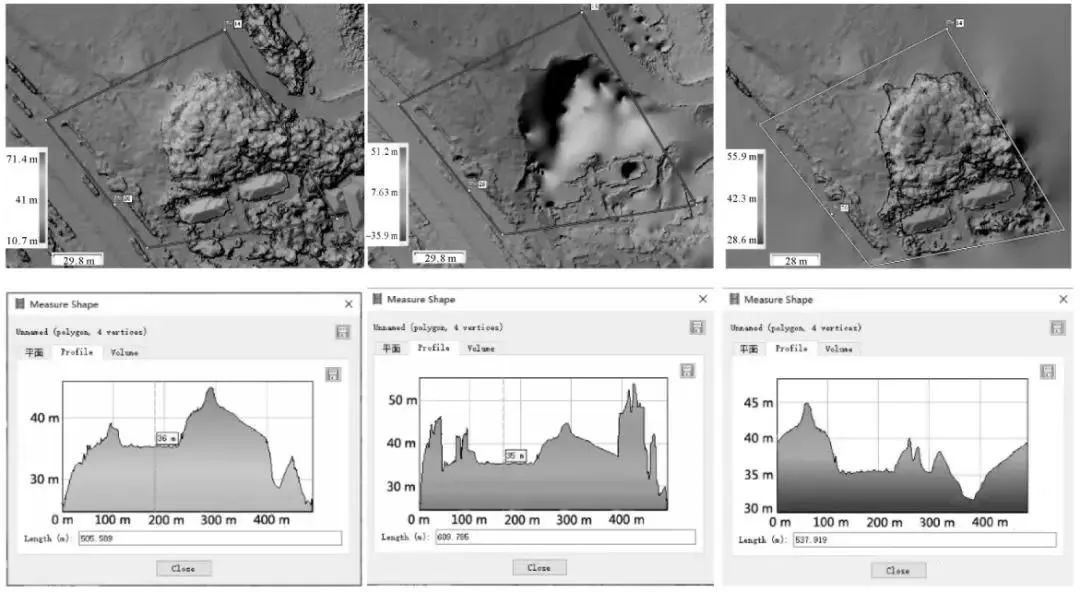 通過對這3種情況分別進行試驗,生成的DEM與反映測區(qū)高程起伏情況的橫截面情況如下圖所示。同時,設(shè)定相同的設(shè)計標高和測區(qū)范圍,結(jié)合PhotoScan軟件對3種方法生成的DEM數(shù)據(jù)進行土方計算,其計算結(jié)果見表3。