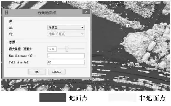 密集點云分類。對稀疏點云數(shù)據(jù)進行點云加密生成密集點云數(shù)據(jù),這些數(shù)據(jù)往往包含一定的噪聲,同時各類地物數(shù)據(jù)混雜無法進行高程值修正,因此需要進行點云數(shù)據(jù)分類。點云分類分兩步:自動分類和目視修正。在進行自動分類前需要進行最大角度、最大距離和單元格大小等參數(shù)設(shè)置,其中最大距離是指有關(guān)點與地形模型之間距離,該參數(shù)確定了最大地面高程變化的情況;最大角度是指地形模型與將該新點與地面點構(gòu)成連線之間的夾角,該參數(shù)確定了單元大小內(nèi)的地面最大坡度情況;單元格大小是指要劃分為點云的小區(qū)大小,該參數(shù)根據(jù)不包含任何地面點的最大區(qū)域大小來劃分。由于測區(qū)分布較多的低矮植被且地形起伏較大,因此將密云被分成大小50m的單元格,將與地形模型相距距離設(shè)置為1m,地形模型與將該新點與地面點連線之間的夾角設(shè)置為15°。利用自動分類功能判斷3個參數(shù)值與檢測點的差值,當小于預(yù)定的3個參數(shù)值時,該點將被分類為地面點數(shù)據(jù),自動分類結(jié)果如下圖所示。