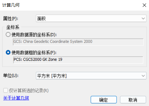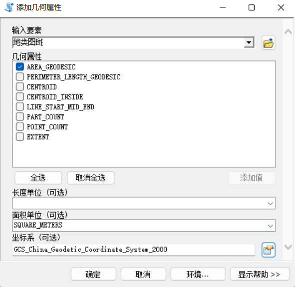 在“添加幾何屬性”對話框中,選中“幾何屬性”中的“AREA_GEODESIC”,然后設(shè)置面積單位,在“坐標(biāo)系(可選)”中設(shè)置地理坐標(biāo)系,然后單擊確定即可——